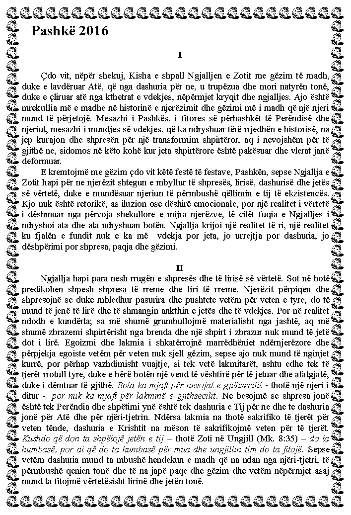 Posted in Mitropoliti i Korçës Joan, Pashkë Pashkë 2016 – Mesazhi i Mitropolitit të Korçës, Hirësisë së Tij +Joanit! Published Date: April 30, 2016 Post Views: 1,046 Author: admin