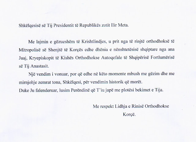 Posted in falenderimi, Mitropolia e Shenjtë Korçë Letër Falenderimi i Lidhjes së Rinisë Orthodhokse Korçë drejtuar Presidentit të Republikës z Ilir Meta Published Date: December 29, 2017 Post Views: 3,531 Author: admin